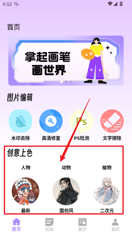 1、进入软件后点击创意上色里面的板块