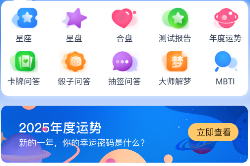 专业工具矩阵:涵盖星座测算、星盘分析、塔罗牌问答、骰子占卜等10余种专业工具,满足从基础娱乐到深度命理探索的多元需求。