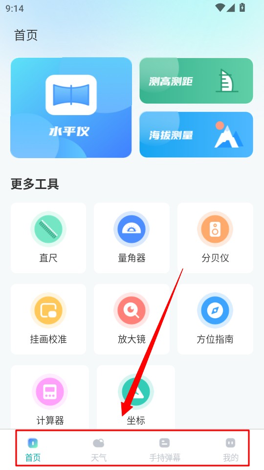 1、进入软件可以看到有水平仪、测高测距、海拔测量等功能