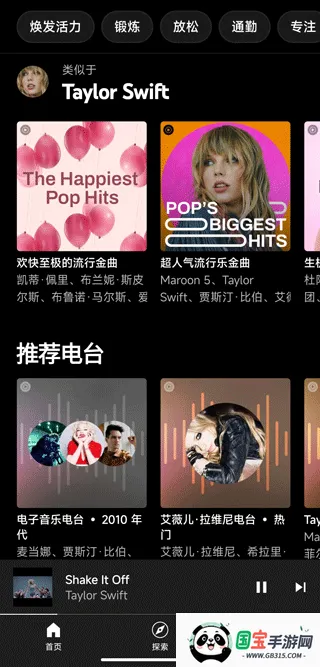 4. 顶部导航栏分类清晰,正在播放时有动态音量柱效果,增强互动感。