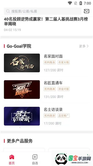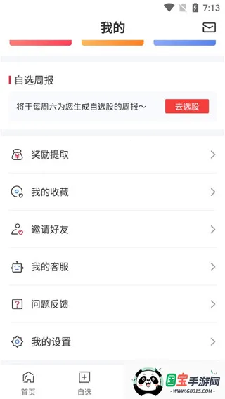 2、软件提供了四大主要板块、分别是首页、自选、行情以及我的管理。