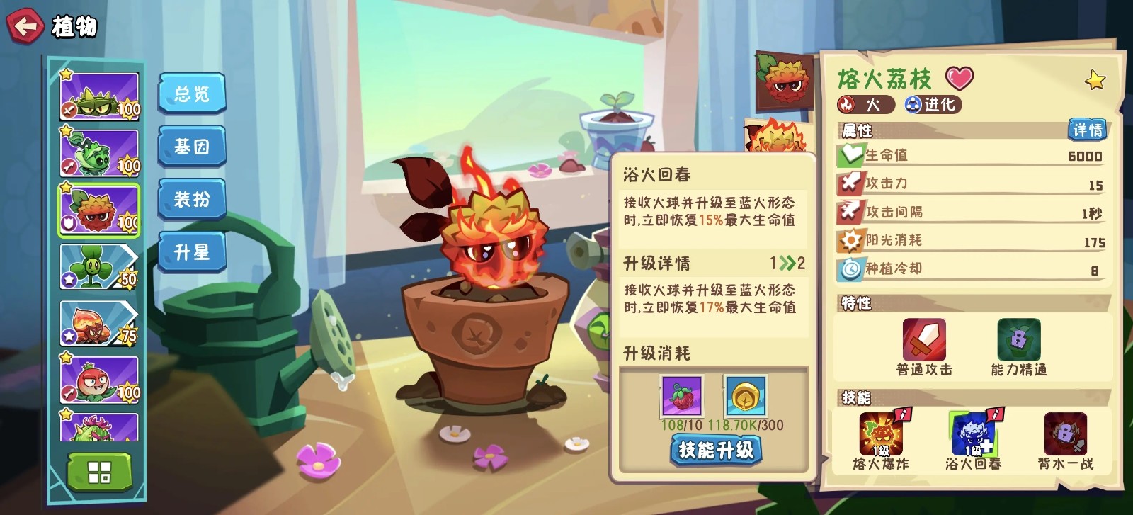 熔火荔枝:在接受熔火向日葵的火球升级时会恢复15%的血量,这就是为什么可以不要恢复植物的原因。