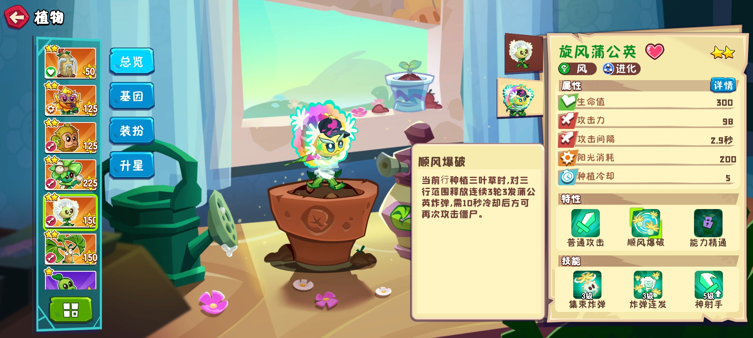 不进化就能锁空军,这个含金量懂的都懂,紫卡仙人掌强度跟大芬一样估计就是逼着你氪蒲公英。核心技能是顺风爆破,本行放三叶草丢3*3的蒲公英炸弹,一命会变成3*5,多种几个蒲公英能一杆清屏,普通图看不出来啥,配合爬塔的减少三叶草cd非常强。6元首冲+68就能拿一命蒲公英,基本是微氪能稳定拿到的最强植物了,一个一命蒲公英随便爬25层塔。不过我建议留着买排骨,除非你跟我一样喜欢赤石